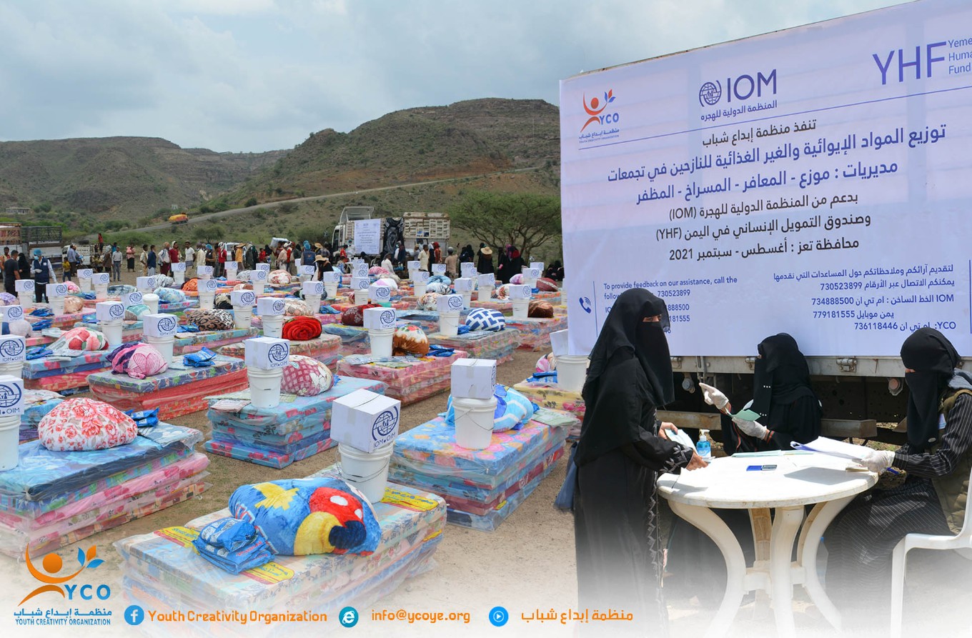 لليوم الثاني على التوالي تنفذ YCO توزيع حقائب المواد الغير الغذائيه NFIS ومخيمات الإيواء ESKS للنازحين المتضررين بالمخيمات والتجمعات بمديريات موزع-المعافر- المسراخ- المظفر بتمويل من المنظمة الدولية للهجرة IOM وصندوق التمويل الإنساني في اليمن YHF