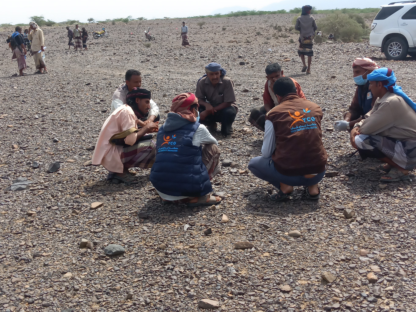 جانب من جلسات التوعية للجان المجتمعية التي نفذتها منظمة إبداع شباب بوسائل حماية المأوى من الأمطار و الطرق المناسبة للتركيب في مواقع إدارة YCO في مديرية موزع تعز