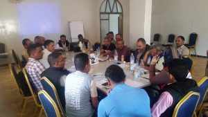جانب من اجتماع الكتلة الفرعية للمأوى و إدارة وتنسيق المخيمات – تعز في مكتب منظمة ابداع شباب – الشمايتين بحضور منسق الكتلة سليم العزعزي وممثلين المنظمات