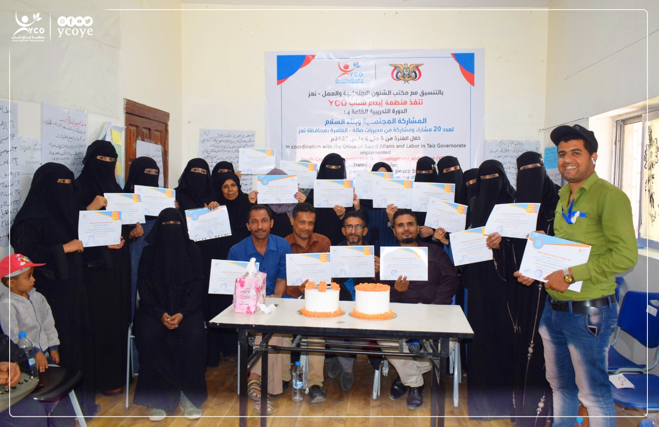 منظمة ابداع شباب للتنمية والسلام #YCO تحتفي باختتام الدورة التدريبة الخاصة بالمشاركة المجتمعية وبناء السلام لعدد ۲۰ مشارك ومشاركة من مديريات القاهرة – صالة بمحافظة تعز والتي استمرت لمدة اربع أيام خلال الفترة من 5 حتى 8 مارس 2023
