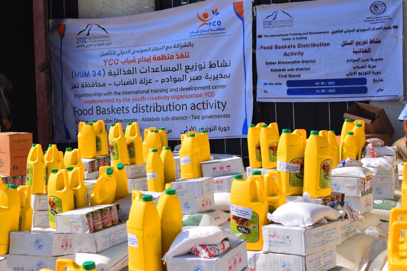 اختتام توزيع منظمة ابداع شباب للتنمية والسلام #YCO بالشراكة مع المركز السويدي الدولي للتأهيل #ITDC للمساعدات الغذائية الدورة الاولى لعدد 1500 سلة غذائية بمديرية صبر الموادم عزلة الضباب , و 800 سلة بمديرية المواسط خلال شهر سبتمبر 2023م